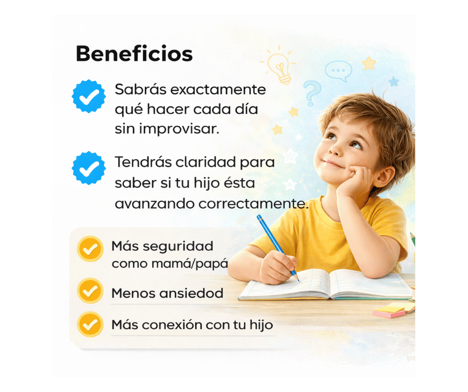 ¿Sabes que quieres ayudar a tu hijo, pero no sabes por dónde empezar? Este ebook elimina las dudas y te entrega una guía día por día. Durante el próximo mes, no tendrás que pensar qué hacer; simplemente abre el plan y dedica 10-15 minutos a la actividad sugerida.